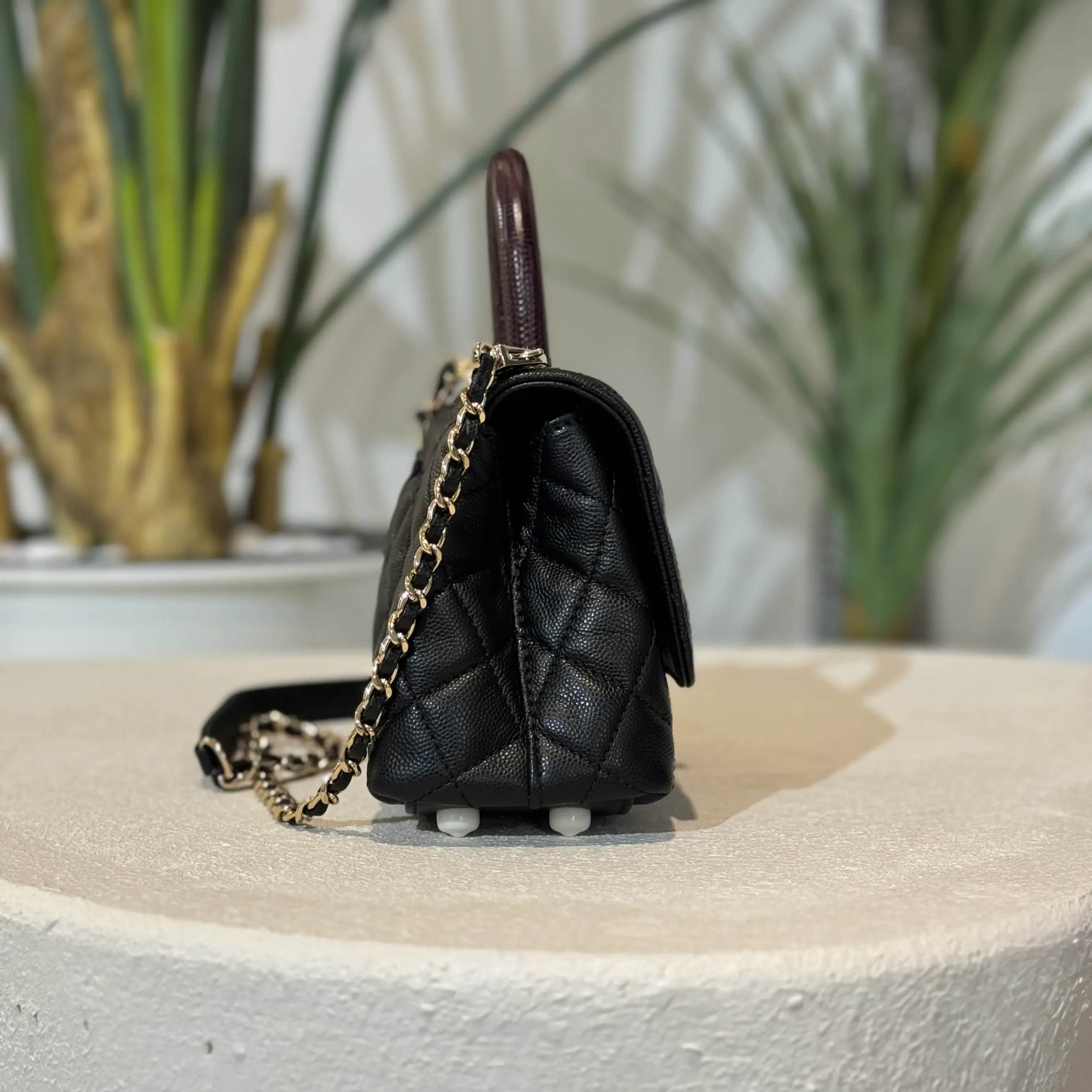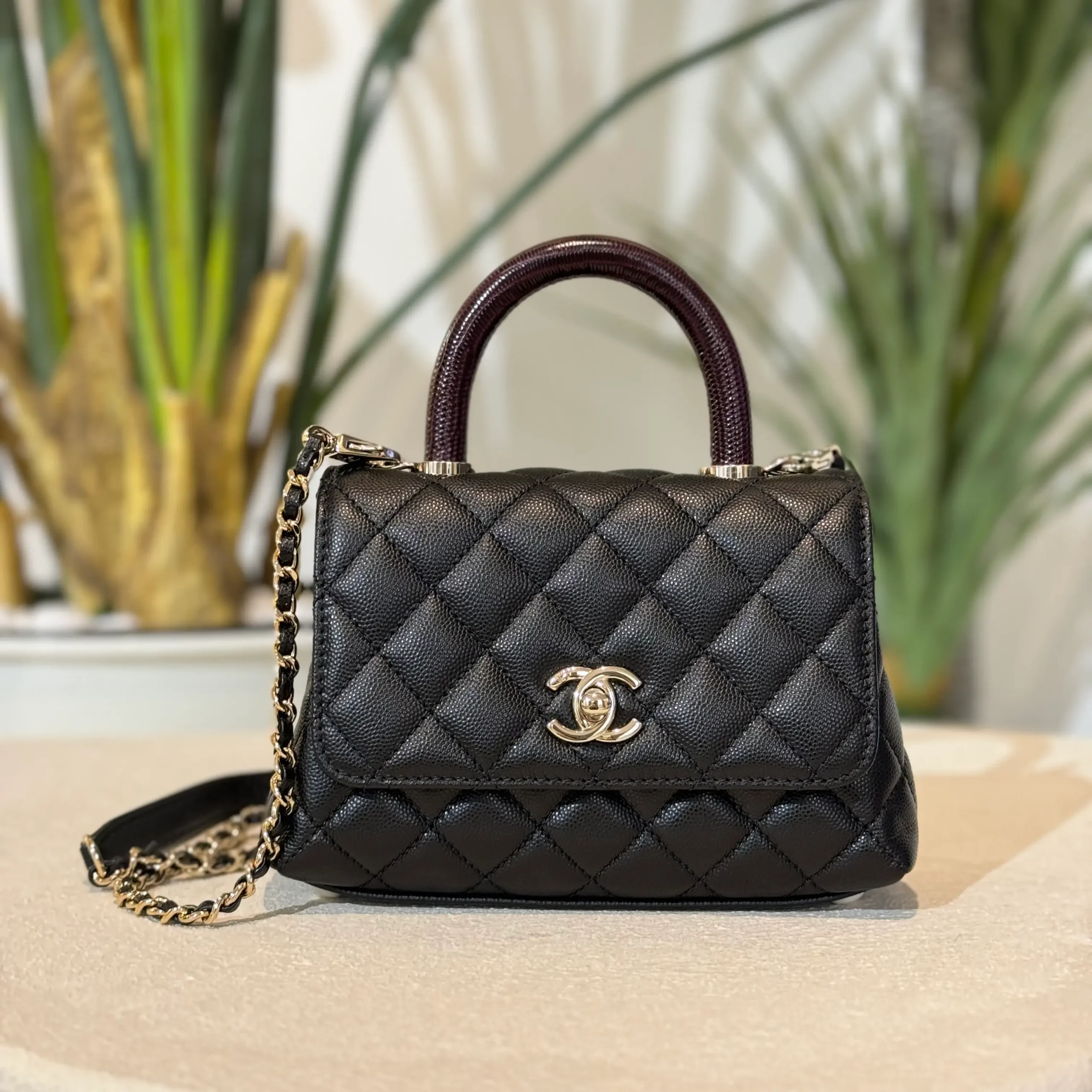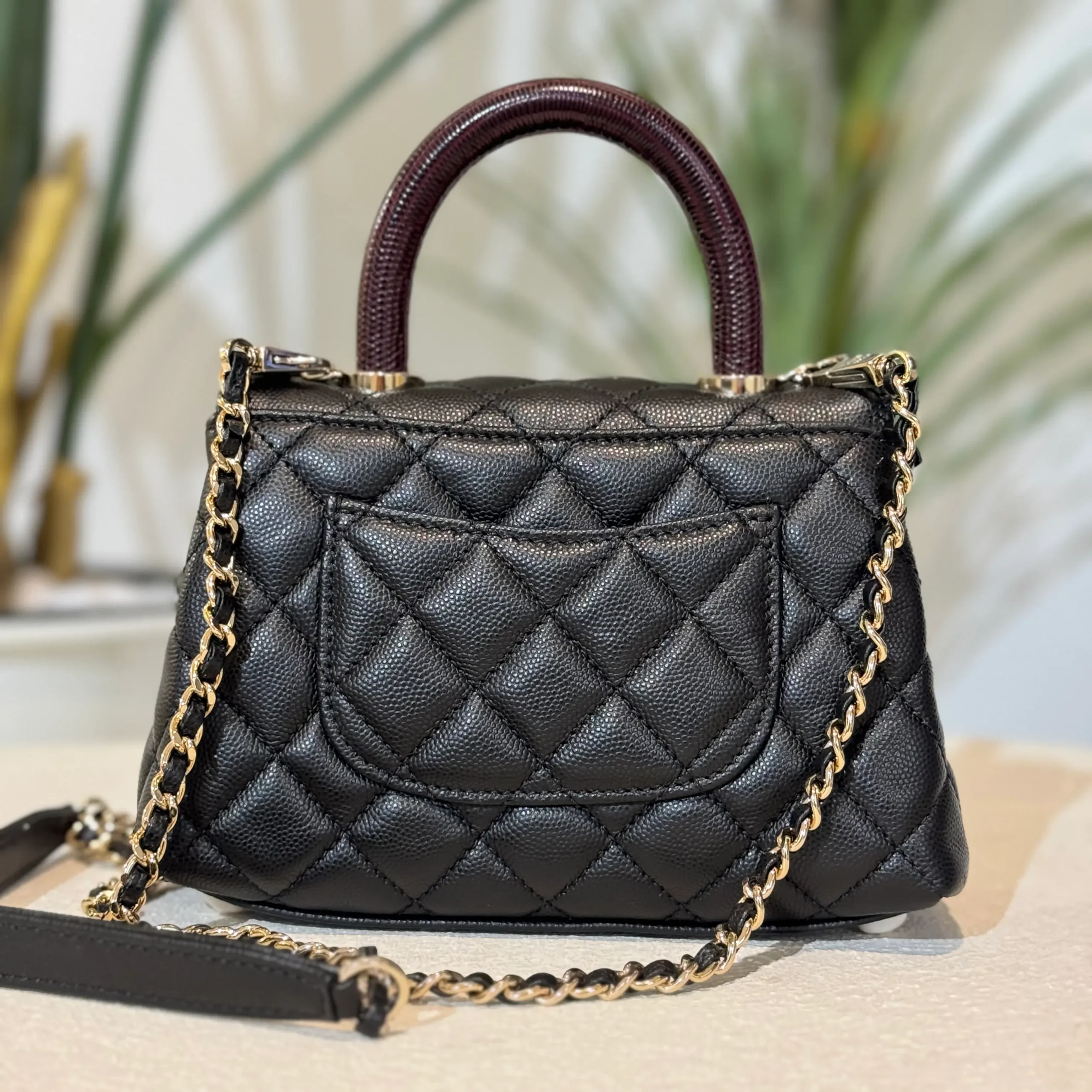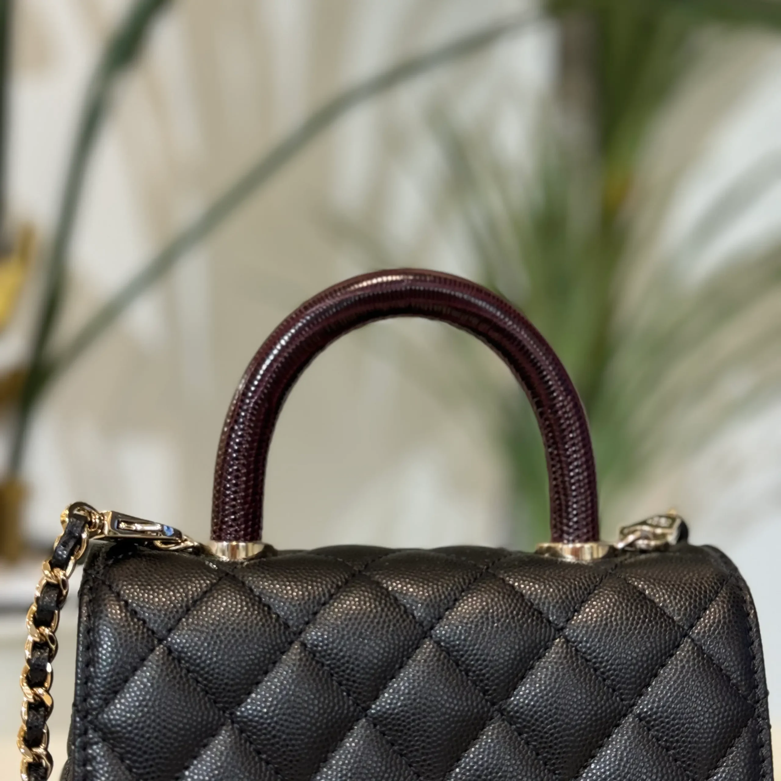 - Material: Caviar & Maroon Lizard Handle with Champagne hardware