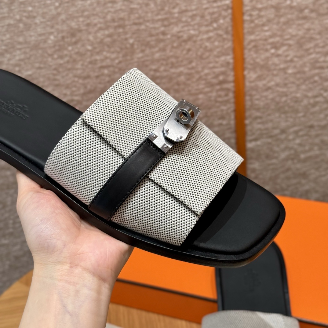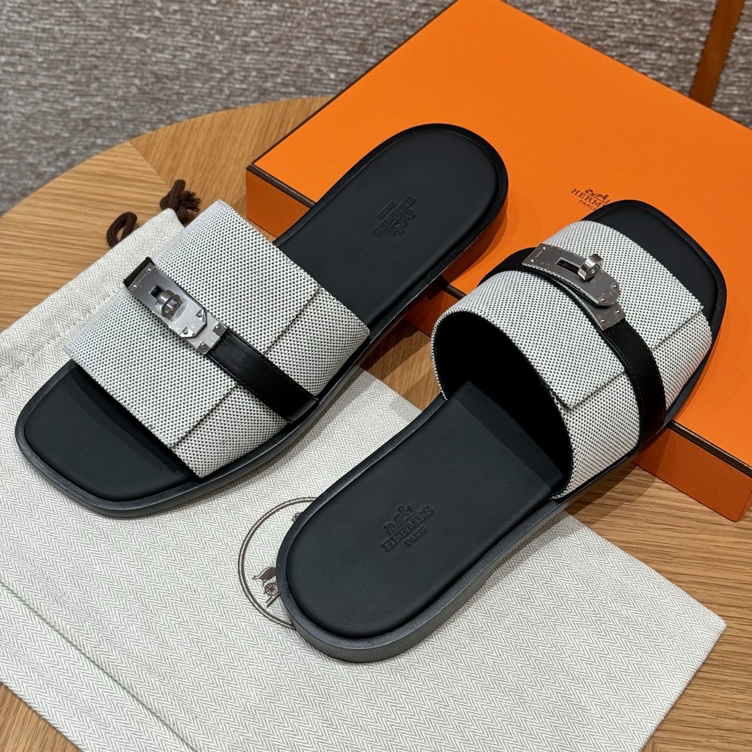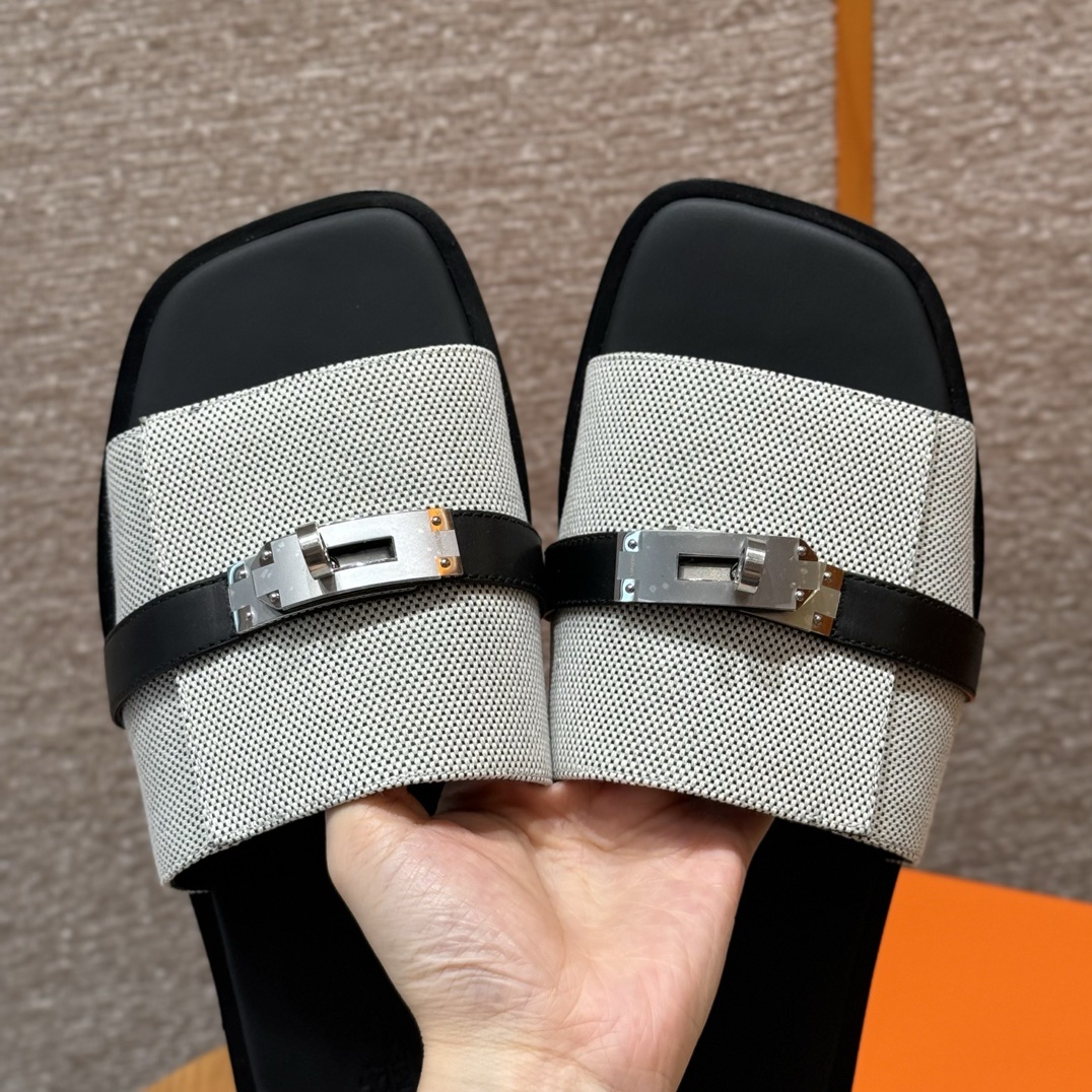 Sandal in H canvas and calfskin with iconic palladium-plated Kelly buckle.