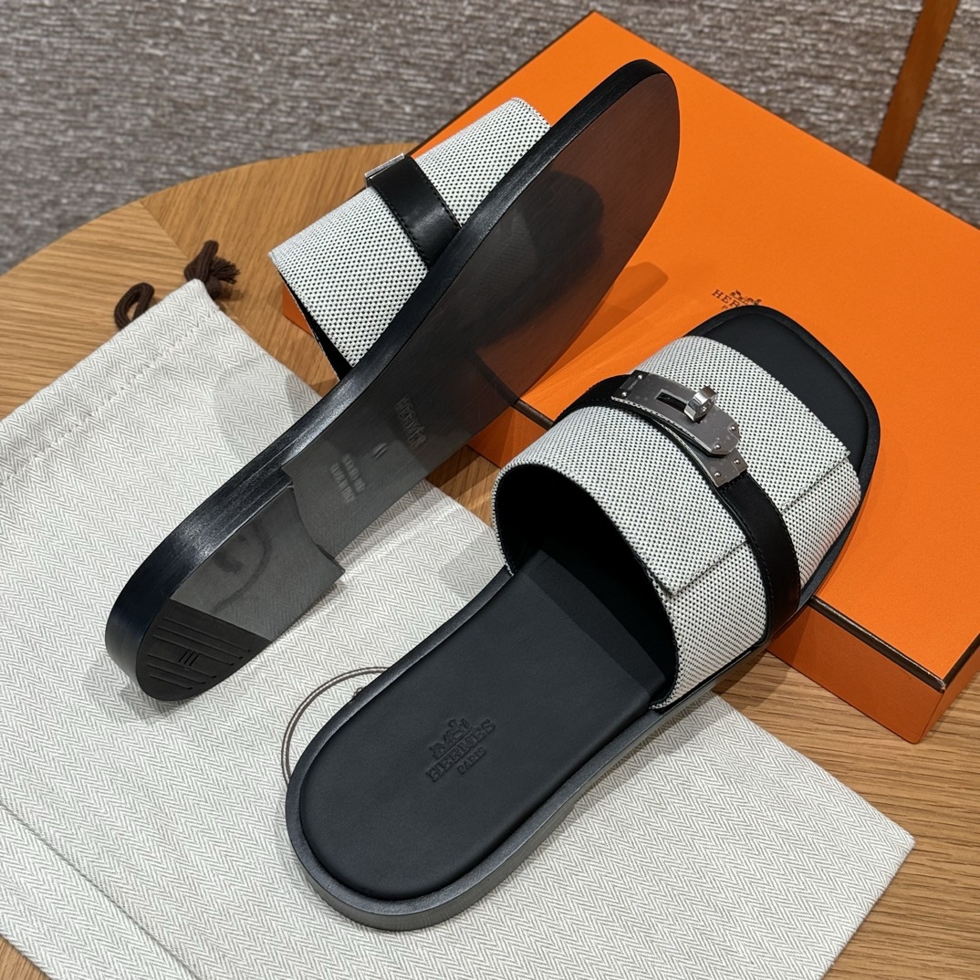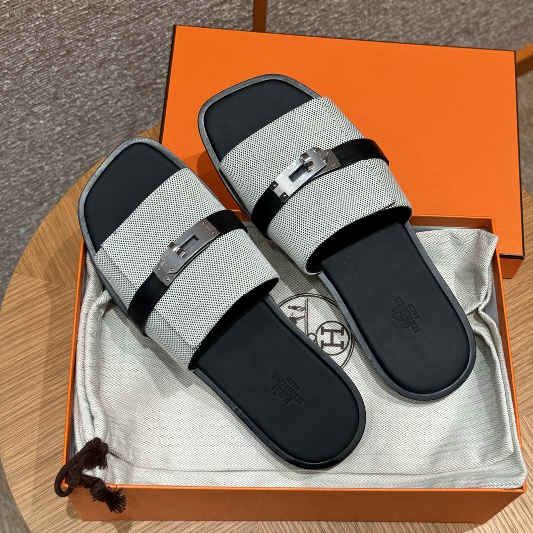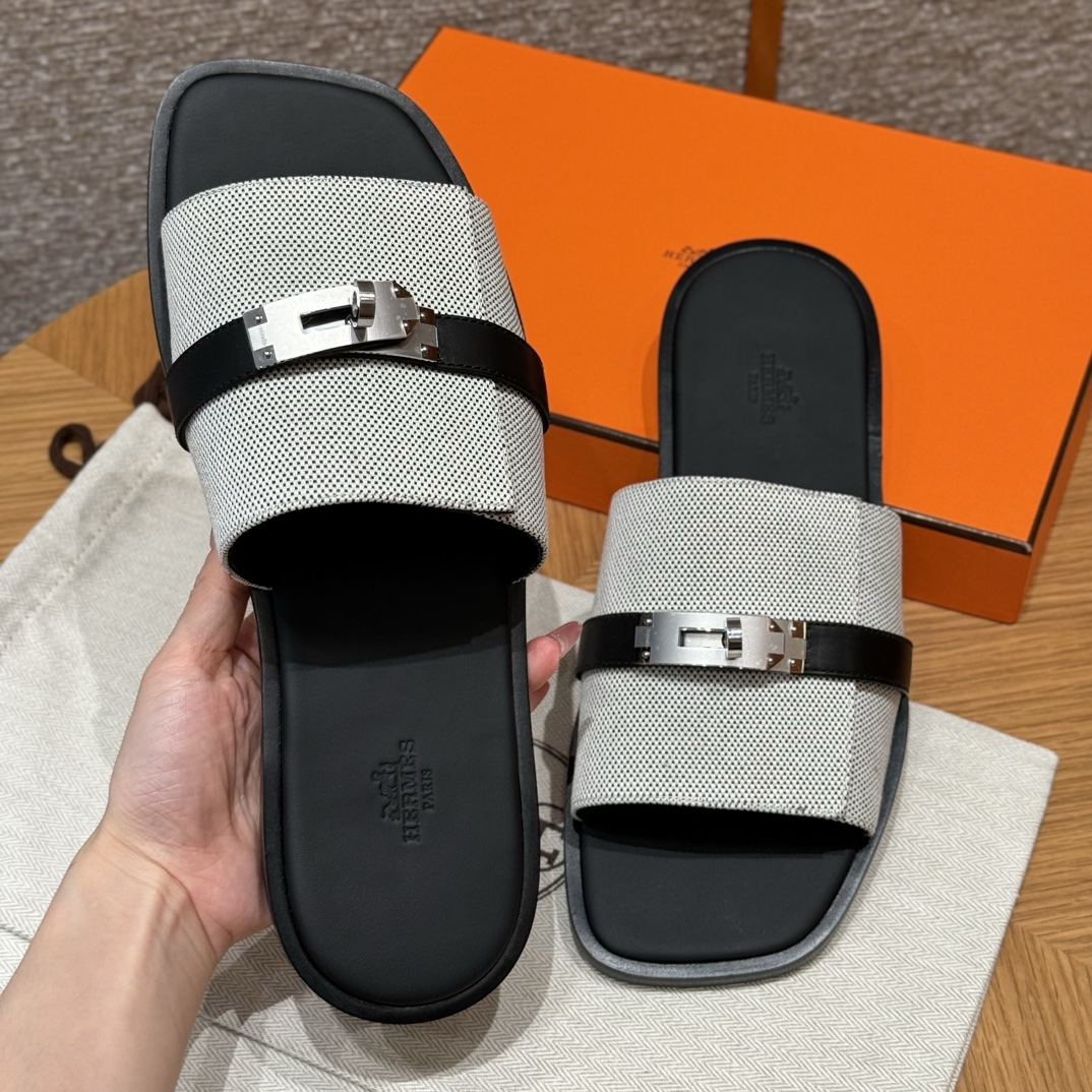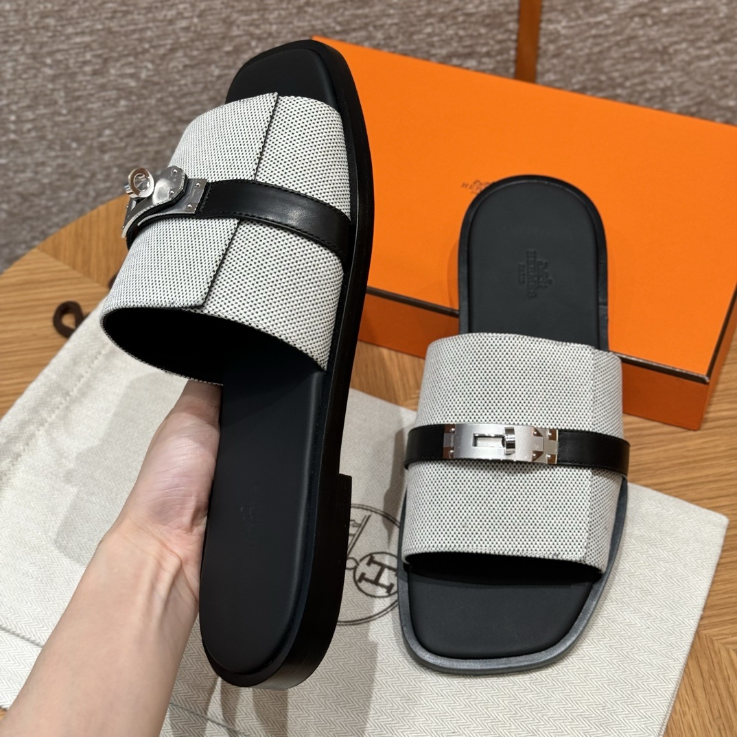 Sandal in H canvas and calfskin with iconic palladium-plated Kelly buckle.